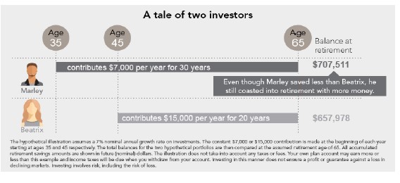 But having time on your side can actually be one of the best reasons to start saving for retirement now. That’s because you may not be considering the opportunity cost of not being in the market.